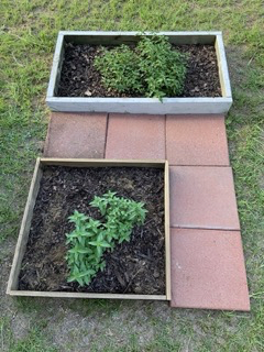 This is our newly planted little tea bed. The far box has our chocolate mint in it and the closer box has our "meadow" mint. The meadow mint started as a single sprig! I allowed it to root in water then planted it in a pot to grow until I had a bed to plant it back into. We just planted those into the ground a month or so ago and they have flourished!